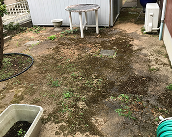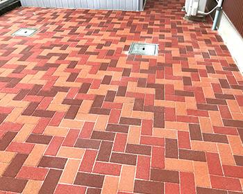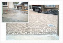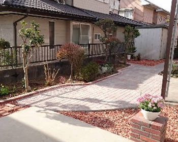 草引きが大変なので、簡易舗装材を塗られていましたが、隙間から生えてきたので困っておられました。防草シートを敷設し、インターロッキングにて舗装しました。レイアウトパターンもお好みで変えられます。